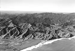 ![]() The north end of the Herangi Range viewed from Karioi; Taranaki Point in the near distance | |