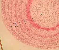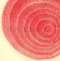 Root cross section (30 μm) of Penstemon venustus. Lignified tissue is stained reddish using Phloroglucinol/HCL. Black markers denote annual ring borders. Individual collected at the Wallowa Mts., Oregon, USA (2003)