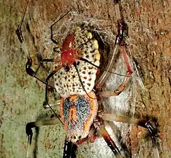 Herennia multipuncta, commonly known as the spotted coin spider,[1] is a species of spider in the family Nephilidae native to Asia.[2] It exhibits sexual dimorphism, the female being much larger than the male. It weaves a small web on the trunk of a tree or the wall of a building and is well camouflaged by its dappled colouration.