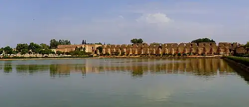A third element of the complex is the vast water basin or artificial lake that stretches next to the main structure, the Sahrij Swani or Sahrij Souani ("Basin of the Norias"), also known as the Agdal Basin.[17][3][2][19] The nearly rectangular basin measures 148.75 by 319 meters and is 1.2 meters deep on average.[6] Although the basin was apparently also used for leisure by palace residents who bathed here or wandered around on small boats, its purpose appears to have been primarily utilitarian and integrated to the royal city's water supply.[2][17][6] It was supplied with water by the adjacent House of the Ten Norias on its southeast side.[6][17] In this regard it resembled the water basin in the Menara Gardens of Marrakesh.[17] Possibly because of its importance, it was enclosed by its own two-meter-thick defensive wall, of which only a small section remains to the southwest (separating it from the Beni Mohammed neighbourhood beyond).[6][17]