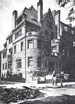 The first floor of the mansion is finished in undressed sandstone, with the exception of the 1919 extension. The rest of the exterior is constructed of Belleville brownstone with a brick terra cotta facing.[8] The entrance is accessed by a broad stone staircase, flanked by two semicircular towers or bays which rise to the height of the third floor where they each form a separate balcony. A third balcony on the second floor runs between the two. Each of the bays features three large bay windows per floor. Above and between the bays, on the third floor, are two semicircular windows, surmounted by a single rectangular window in a gable, which in turn is flanked by two tall chimneys. The roof itself is steeply sloped, gabled and tiled. The bays at the front of the building are echoed by a third, smaller ground floor bay in the center of the building in Henry Street.[9]