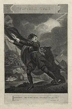An 1807 print of Act III, Scene iii: Exit Antigonus chased by a bear.
