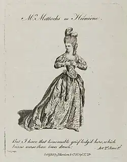 A depiction of Mrs. Mattocks as Hermione, from a 1779 performance at the Theatre Royal in Drury Lane