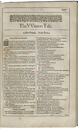 1. ^ WT comes last, following Twelfth Night which uncharacteristically ends with a blank recto page, suggesting to Arden editor J.H.P. Pafford there was some hesitation as to where WT belonged at the time of printing the Folio. (J.H.P. Pafford, ed. The Winter's Tale (Arden Shakespeare) 3rd ed. 1933:xv–xvii.)
