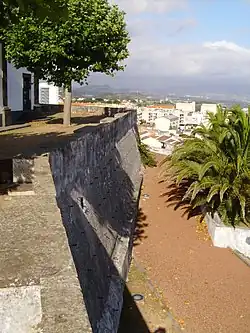 Located in an isolated urban context, implanted on an elevated hilltop over the historic Fort of Mãe de Deus, with plastered walls, relatively close to the University of the Azores.[1] The church's frontal access is marked by a basalt staircase of two flights, flanked by rectangular plinths, plastered and painted in white, caped by faceted pillars and two orders of plinths.[1] The courtyard is covered in sod, and dotted by trees.[1]