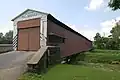 Herr's Mill Covered Bridge was built in 1844 by Joseph Elliot and Robert Russell at a cost of $1787.[5] It has a double-span, double-arch Burr arch truss construction. In 1875, the bridge was rebuilt by James C. Carpenter at a cost of $1860.[1] The bridge was later bypassed by a new concrete bridge and is now on the private property of the Mill Bridge Village Camping Resort. Owner Brian Kopan was quoted as saying "The bridge is in fine condition. We’re hoping to keep it as it is." In October 2018, the bridge was dismantled and was being moved to Elizabethtown, before it fell into the creek.[6]