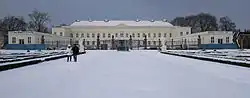 The Great Garden suffered immense damage during World War II; the British Royal Family had requested the Royal Air Force not to attack the palace,[2][4][5] at the time still owned by the House of Hanover, but it was damaged by bombs during an air raid in 1943.[6][7][8] The ruins of the palace were almost completely torn down after the war; the outside staircase once leading up to the entrance was salvaged[9] from the debris and moved next to the Orangerie building where it can be seen today. In 2009, the decision was made to rebuild the palace, construction began in 2010,[10] and the rebuilt Herrenhausen Palace was reopened on 18 January 2013.[11]