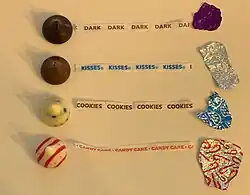 ![]() Hershey's Kisses in foil wrappers. The paper strip coming out the top identifies each flavor. | |