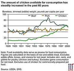 Meat is a major component of American diets. Data from 1960 show the combined annual per capita consumption of beef, pork and chicken at 148 pounds; in 2004, that amount increased to 195 pounds a year.[5] Ground beef made up 42% of the beef market in 2000. Beef consumption, particularly ground and processed beef, is highest in households with incomes at or below 130 percent of the poverty level.