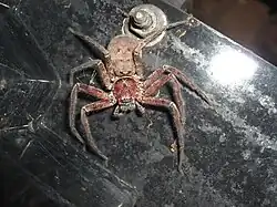 Heteropoda cervina shelters under bark or other dark places during the day, emerging in the evening to find prey, often on tree trunks. These spiders are also known to enter houses, though they are extremely timid, and their bite โ while painful โ is only mildly toxic.[3] Their unequally sized legs, after which the genus is named, are splayed to the side allowing very fast sideways movement and abrupt change of direction. They have strong, curved fangs, a flattened body and two rows of four eyes. Males and females look alike, females larger. Females lay their eggs in large "cocoons". Heteropoda cervina is very similar in appearance to the related species Heteropoda jugulans. There has been a great deal of confusion regarding this species, because of a misidentification of Heteropoda jugulans as Heteropoda cervina by Ramon Mascord (1970, 1980) perpetuated by other authors.[2][4]