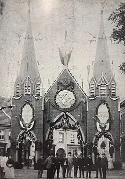 The second construction phase, that included the front facade with the two towers, and restoration of the existing part began in November 1887.[1][2] The contract was worth fl. 103,000 after it was decided to add four instead of five bays. The towers topped out in October 1888. A construction worker died that same month after falling down from a height of 30 metres (98 ft).[2] The Heuvelse kerk was finished in 1889 and consecrated on July 1 by Bishop Adrianus Godschalk of the Diocese of 's-Hertogenbosch. The event was followed by a Mass, while celebrations had started the day before. The church was decorated, and six temporary triumphal arches were erected spanning streets close to it, one of which was a scale model of the church.[5][6][7]