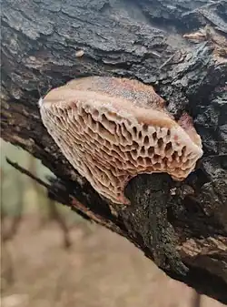 Wasp nest polypore is an irregular hoof shaped bracket fungus approximately 25–80mm in diameter. With its hexagonal and radially elongated pores it gives the fungus the appearance of a wasp nest.[2] The flesh has a hard woody texture that extends about five centimetres from the substrate with pores that change in colour from off white to dark brown depending on age.[3] The spores are smooth and cylindrical 14–17 × 5–7 micrometres.[4] The upper surface attached to the substrate can be hairy[4] and has bumps and groves that look like channels[2]