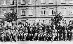 The permanent Higher Officers' Courses were established on 1 April 1921 by the order of the Minister of Defense in Kaunas.[13] They were supposed to last five months.[14] The official opening of the courses took place on 13 April.[15] The beginnings were difficult – there were not enough lecturers, there were no textbooks, about half of the lectures were held in Russian due to poor Lithuanian language skills, etc.[16] Due to increased international tensions, the courses were suspended from 1 June to 20 September 1921.[17] The first class of 50 officers graduated on 30 January 1922.[5] The courses were extended to eight months, placed greater emphasis on tactics and wargames, and added foreign language (English, French, German) lessons so that graduates could follow foreign military press. The second class of 69 officers graduated on 6 October 1922.[6]