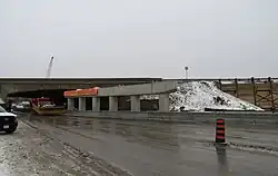 The interchanges at Rutherford Road and Major Mackenzie Drive in Vaughan were extensively reconstructed to modern Parlo A4 configurations in 1993 and 2004,[54] respectively, while a new partial interchange was added for Bass Pro Mills Drive in 2004 to serve the Vaughan Mills shopping centre. In late 2010, the Portage Road overpass crossing Highway 400 was opened.[55] The Highway 9 (Davis Drive) overpass was initially twinned with an addition span on the north side in the late 1990s, however this still permitted only six lanes of Highway 400 to pass underneath, so a decade later the twin structures were replaced with a wider single bridge that was long enough to accommodate future widening of the freeway to eight lanes.[56][57] The North Canal bridges are to be replaced in order to accommodate eventual expansion of the route and increase vertical clearance over Canal Road.[58]