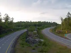 At Craighurst, the highway again turns north-east, skirting the Copeland Forest and the ski hills of the Oro Moraine, to meet Highway 12, which runs concurrently with the 400 between Exits 141 and 147, in Coldwater.[16] From here, the highway takes on the Trans-Canada Highway designation, and follows a predominantly north-western heading along what was the route of Highway 69, toward the planned terminus of Sudbury.[17] In Muskoka and Parry Sound Districts, Highway 400 is in most sections a twinned four-lane highway,[10] but several bypasses have and are being built to circumvent the communities along the way. North of the interchange with Highway 522 near Nobel, the divided freeway merges, narrows to two lanes and becomes Highway 69 which continues north to Sudbury.[17][18] At Port Severn, Highway 400 meets the rugged Canadian Shield, and winds its way north through the granite, often flanked by towering slabs of rock.[10]