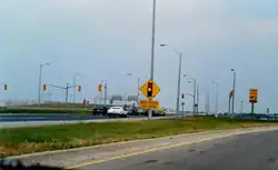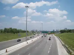 Highway 409 begins at Airport Road as the knotted flyovers from Pearson International Airport converge into the freeway from the various terminals.[2] The highway then turns northeast and encounters Highway 427. Through this section to Highway 427, the highway is maintained by the Greater Toronto Airport Authority (GTAA) and has a posted speed limit of 60 kilometres per hour (37 mph).[4][5]