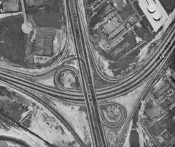 However, at the same time, Toronto was embroiled in heated debate over the fate of its planned urban expressway system. When the Spadina Expressway was cancelled in 1971, the planned Belfield Expressway was completely revised. Instead of continuing northwest from Highway 427 and through Malton's four-corners at Derry Road and Airport Road towards Brampton, it would curve southwest and provide access to the developing Toronto International Airport.[8] At the recently opened interchange between Highway 401 and Highway 427, the off-ramp from westbound Highway 401 to Carlingview Drive was temporarily signed as "Airport Expressway", since Carlingview Drive had a temporary on-ramp to northbound Highway 427 near the Renforth Drive underpass but that on-ramp was closed in the early 1970s. Direct access from westbound Highway 401 to northbound Highway 427 would be restored a few years later with the Belfield Expressway which had greater capacity then the short-lived Carlingview ramps.[9][10]