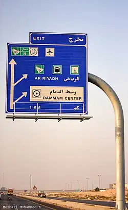 Highway 40 (Arabic: الطريق السريع ٤٠) is a major east–west six-lane controlled-access highway in Saudi Arabia, connecting Jeddah, the second-largest city in the kingdom, to the economically prosperous and oil-rich Eastern Province, making it the kingdom's only coast-to-coast highway. The highway runs in a northeast–southwest direction, traversing the width of the entire Arabian Peninsula. Being part of the Saudi road network, Highway 40 carries the Arab Mashreq Route 80M (Jeddah–Mecca–Riyadh–Dammam–Manama).[3] The highway spans 1,395 km (867 mi) between Jeddah (at the interchange with Highway 5 near Prince Abdullah Al Faisal Stadium) and Dammam at the interchange with Highway 613; via Riyadh. The route serves Mecca via the Umm al-Qura' Road, Ta'if via Highway 287 and Highway 267, Riyadh via Highway 522, Hofuf via Highway 75, Buqayq via Highway 607, and Khobar and Dhahran via Highway 95.[1][4][5][6]