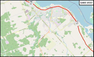Within Pembroke, Highway 62 initially ended at the intersection of Trafalgar Road and Pembroke Street West.[25] The completion of the Des Allumettes Bridge southeast of Pembroke, in 1957, resulted in the extension of Highway 62 to the Quebec boundary in 1960, almost entirely a concurrency with Highway 17.[26][27][28] In 1966, Highway 62 was extended south of Madoc to Highway 14 at Foxboro when several Hastings County roads were taken over by the DHO on April 1 of that year.[29]