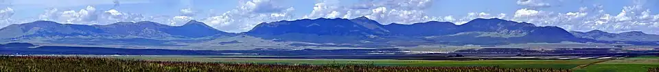 The area is an Eocene volcanic complex[4] and is rich in potash. Many of the extrusive rocks and some of the dike rocks contain abundant phenocrysts of a clear analcime that appears to be primary. Pseudoleucite is an abundant constituent of many of the igneous rocks.[5] The Shonkin Sag, a glacial meltwater channel, borders the Highwood Mountains to the north.