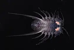 In one study, biological sampling of the walls of the trough took place at six sites between 690 and 1,561 m (2,264 and 5,121 ft) deep.[35] Compared to similar sampling in the more northern Bay of Plenty there were higher abundances in the Hikurangi Margin of many crustaceans and worms such as mud dragons, ostracods, nematode worms, copepods, tanaidacea, segmented worms, isopods and amphipods.[37]