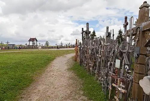 Hill of Crosses (Lithuanian: ⓘ) is a site of pilgrimage about 12 km north of the city of Šiauliai, in northern Lithuania. The precise origin of the practice of leaving crosses on the hill is uncertain, but it is believed that the first crosses were placed on the former Jurgaičiai or Domantai hill fort after the 1831 Uprising.[2] Over the generations, not only crosses and crucifixes, but statues of the Virgin Mary, carvings of Lithuanian patriots and thousands of tiny effigies and rosaries have been brought here by Catholic pilgrims. The exact number of crosses is unknown, but estimates put it at about 55,000 in 1990[3] and 100,000 in 2006.[4] It is a major site of Catholic pilgrimage in Lithuania.