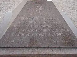 After the dissolution of the Soviet Union in 1990, the practice of Lithuanian cross-crafting became very popular.[14] Visitors were able to make crosses out of small twigs and rocks and tie them together with grass,[15] in order to show their support. Due to the symbolism of cross-crafting during the Soviet occupation, UNESCO named Lithuanian cross-crafting in the lists of good safeguarding practices and intangible cultural heritage.[16] The hill stood as a testament to the Lithuanian people's determination to preserve their religious and national identity during these times. As a result, in the post-Soviet years, the number of crosses exploded. Free from religious oppression, the Lithuanian public was able to practice their religious beliefs without fear of persecution. Due to its religious significance, it became a site of catholic pilgrimage. On September 7, 1993, Pope John Paul II visited the Hill of Crosses, declaring it a place for hope, peace, love, and sacrifice. In 2000, a Franciscan hermitage was opened nearby. The interior decoration draws links with La Verna, the mountain where St. Francis is said to have received his stigmata.[17]