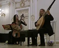 Her long-time performing partner is Lee Santana, who plays the lute, theorbo, chitarrone, and baroque guitar. In addition to an original 18th-century gamba made by Matthais Alban in Tyrol, 1687, she plays a seven-string Tielke replica made by Ingo Muthesius and a six-string Italian viol made by Claus Derenbach.