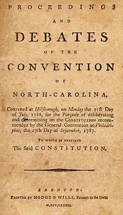 - ^ "Proceedings and Debates of the Convention of North-Carolina, Convened at Hillsborough, on Monday the 21st Day of July, 1788, for the Purpose of Deliberating and Determining on the Constitution Recommended by the General Convention at Philadelphia, the 17th Day of September, 1787: To Which is Prefixed the Said Constitution". 1788. Retrieved July 29, 2019.
