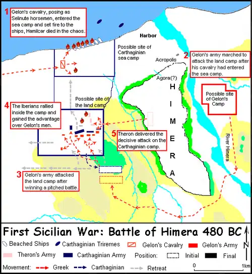The magnitude of the armament sent under Hamilcar, who is said to have landed in Sicily with an army of 300,000 men, sufficiently proves that the conquest of Himera was the pretext, rather than the object, of the war. However, it is likely that the growing power of Himeria in the immediate vicinity of the Carthaginian settlements of Panormus and Solus had already caused concern among the Carthaginians. Hence it was against Himera that the first efforts of Hamilcar were directed. Theron, who had thrown himself into the city with all the forces at his command, was able to maintain its defence until the arrival of Gelon of Syracuse. Despite the numerical inferiority of his forces, he defeated the army of the Carthaginians with such slaughter that the Battle of Himera in 480 BC was regarded by the Greeks of Sicily as worthy of comparison with the contemporary victory of Salamis.[6] The same feeling probably gave rise to the tradition or belief, that both triumphs were achieved on the very same day.[7]