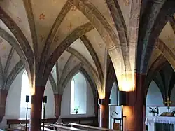 Today, the crypt is called the Knight's Chapel and is used as a devotional space for the Day Care Center for the Disabled. A small area adjacent to the nave with the sarcophagi of the margraves is divided by a partition wall that does not reach the ceiling. Most of the room is used for devotions and ceremonies and is furnished accordingly. The vault ends with ornate keystones, which have coats of arms of local noble families in rounded form and other colored ornaments, including a pentagram, as a motif.