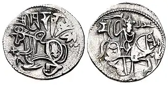 The Hindu Shahis issued silver jital coinage which underwent wide circulation from nearby Sindh[11] to northeastern Europe.[12] They were first "discovered" by James Tod, a British orientalist in 1822.[13] These coins exhibit progressive debasement with time, with a regular decrease of silver content, allowing for the sequencing of the coinage.[14] Early issues do not mention personal names but only generic titles, thereby not matching with the names found from literature.[15] The characteristic motif of a horseman on the reverse with a bull on the obverse goes back to the Indo-Scythian ruler Azes I.