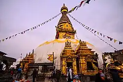 - ^ Inden, Ronald. "Ritual, Authority, And Cycle Time in Hindu Kingship." In JF Richards, ed., Kingship and Authority in South Asia. New Delhi: Oxford University Press, 1998, p.67, 55"before the eighth century, the Buddha was accorded the position of universal deity and ceremonies through which a king attained to imperial status were elaborate donative ceremonies entailing gifts to Buddhist monks and the installation of a symbolic Buddha in a stupa....This pattern changed in the eighth century. The Buddha was replaced as the supreme, imperial deity by one of the Hindu gods (except under the Palas of eastern India, the Buddha's homeland)...Previously the Buddha had been accorded imperial-style worship (puja). Now as one of the Hindu gods replaced the Buddha at the imperial centre and pinnacle of the cosmo-political system, the image or symbol of the Hindu god comes to be housed in a monumental temple and given increasingly elaborate imperial-style puja worship."