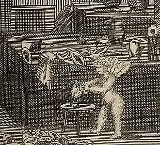 - ^ title art to Cap. XII. Hintzelmann ist ein fleissiger Aufseher auf die Hausshaltung, p. 126, shown right. Cf. also Feldmann(1704)-Hinzelmann-p023a-Hinzelmann-mit-Flügeln.jpg, the title art to Cap. II. Von der Situation des Schlosses Hudemühlen, auch von der Wohnung der Gespenster, p. 23.