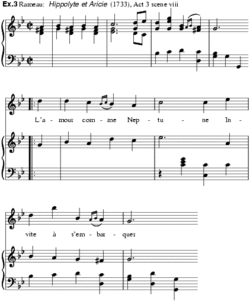 Others, however, felt the music was bizarre and dissonant; Hippolyte was the first opera to be described as baroque, then a term of abuse.[9] They saw Rameau's work as an assault on Lullian opera and French musical tradition. As Sylvie Bouissou puts it:[11]