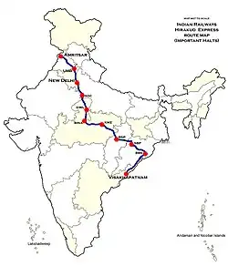 The 20807 / 20808 Hirakud Superfast Express is a tri-weekly express train which runs between Amritsar and Visakhapatnam. It passes through the cities of Jalandhar, Ludhiana, Ambala, Kurukshetra, Panipat, Delhi, Mathura, Agra, Gwalior, Jhansi, Sagar, Damoh, Katni, Umaria, Shahdol, Anuppur, Bilaspur, Raigarh, Jharsuguda, Sambalpur, Angul, Talcher, Dhenkanal, Naraj Marthapur railway station, Bhubaneswar, Khurda Road, Brahmapur, Palasa, Srikakulam Road & Vizianagaram. Hira means diamond and Kud means island in Sambalpuri language spoken in Western Odisha. Sambalpur was famous as an ancient diamond mine and reference about it can be found in the works of Claudius Ptolemy, Edward Gibbon, Jean-Baptiste Tavernier. Hirakud Express is named after the famous Hirakud Dam in Sambalpur, Odisha which is one of the longest dams of India.