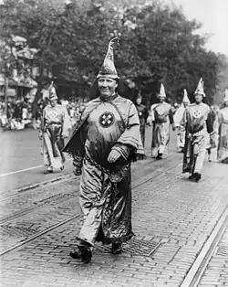 Evans initially supported violence against minorities, remembering a lynching he witnessed as a child. With the Texas Klan, he sought to create "black squads" to attack minorities.[18] He joined several Klan members in kidnapping and torturing a black bellhop and etching the letters KKK into his forehead with acid, ostensibly because they suspected he was involved in pandering prostitutes.[15] Atlanta-based leaders pressured Evans to curb racial violence in Dallas; around then, the Texas Klan had received significant negative publicity after castrating an African-American doctor.[19] The Dallas Klan earned a reputation as the most violent Klan in the nation, and was even more violent than Klans in the Deep South. The Dallas Klan whipped at least 68 victims, both white and black, by the riverbanks for various reasons, including personal grudges, miscegenation, wife beating, adultery, fornication, and bootlegging. The Dallas Klan was also rumored to be responsible for the lynchings of Fred Rouse, a black strikebreaker, and Tom Vickery, a white man who had been accused of killing a police officer. The Dallas Klan attempted to improve its reputation by giving money to widows, charities and churches, holding barbecues, and even having an orchestra and baseball team.[20] It is estimated that around one-third of white Protestants in Dallas were members of the KKK at its peak. Opposition to the Klan grew in Dallas due to the groups's extreme violence; Klan opponents in Dallas were in favor of Jim Crow themselves, but disliked the group's violence and secret rituals.[21][22][23] Although Evans was not morally opposed to violence against minorities,[24] he publicly condemned vigilante activity because he feared that it would attract government scrutiny and hinder potential Klan-backed political campaigning.[15] The change of stance led the leader of the Houston Klan to accuse him of hypocrisy.[19] Although Evans later took credit for a decrease in lynchings in the Southern United States during the 1920s,[25] several Klan members claimed that he surreptitiously encouraged and presided over acts of violence against minorities.[26]