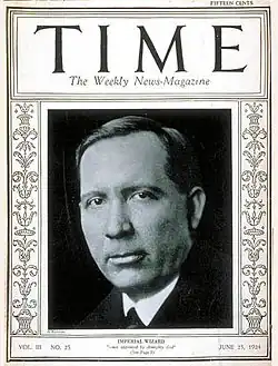 In 1924, the group convinced Republican Party leaders to avoid criticizing it, prompting Time to put Evans on its cover.[101] That year, the Klan supported Calvin Coolidge in his successful candidacy for president of the U.S.[102] Although Coolidge opposed many key Klan platforms, with the exception of immigration restrictions and prohibition, he was the only major-party candidate who did not condemn them.[103] Nonetheless, Evans declared Coolidge's victory a great success for the Klan.[103] Although Republican leaders refrained from attacking the Klan, they were hesitant to support candidates promoted by the group.[104] Significant discussion of the Klan also took place at the Democratic Party's convention;[105] senator and Democratic presidential primary candidate Oscar Underwood, who finished in fifth place with less than 4% of the delegates, decried them as "a national menace."[101] Evans's attempts to elect Klansmen to public offices in 1924 saw limited success[106] except in Indiana.[9]