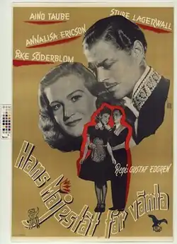 His Majesty Must Wait (Swedish: Hans Majestat får vänta) is a 1945 Swedish comedy film directed by Gustaf Edgren and starring Sture Lagerwall, Åke Söderblom and Aino Taube.[1] It was shot at the Råsunda Studios in Stockholm. The film's sets were designed by the art director Nils Svenwall and Arne Åkermark.