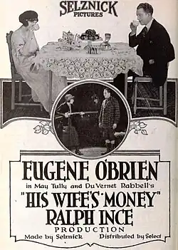 His Wife's Money is a 1920 American silent drama film directed by Ralph Ince and starring Eugene O'Brien, Zena Keefe and Louise Prussing.[1]