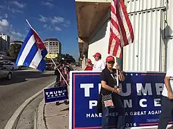 Historically, Cubans are one of the few Latino national origin groups that have consistently been strong supporters of the Republican party.[61] In the 2016 presidential election, over half of the Cuban population voted for Donald Trump.[62] Sociologist Alejandro Portes and politician Rafael Mozo have tried to explain why Cubans do not vote for the Democratic Party. They find that Cubans support the Republican Party out of fear that Democrats will turn the United States into a communist country.[63] Other studies have argued that Cubans do not vote for Democrats because they do not experience immigration related issues, since they are able to apply for permanent residency a year after arriving to the United States through the Cuban Adjustment Act of 1966.[64]