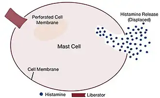 The crux of this theory lies in the assumption that histamine liberators release histamine by displacing it from cells. The mechanism hypothesised by which histamine is displaced occurs in two steps: firstly, the liberator penetrate the membranes of mast cells, compromising the integrity of its membrane. Secondly, now that the cell membrane is pierced, the liberator enters the cell.[8] Since there is no air or free space, this forces the histamine already existing in the mast cell to be displaced outside the cell, thereby releasing and “liberating” it. Some histamine liberators were thought to be organic bases as they are synonymous with histamine since it is a base as well, thus facilitating its displacement.[8]