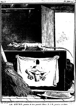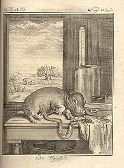 The Histoire Naturelle was translated (in whole, in part, or abridged) into languages including English,[16] German,[17] Swedish,[18] Russian[19] and Italian.[20] R. Griffith published an early translation of the volume on The Horse in London in 1762. T. Bell published a translation of the first six volumes in London between 1775 and 1776. William Creech published an edition in Edinburgh between 1780 and 1785. T. Cadell and W. Davies published another edition in London in 1812. An abridged edition was published by Wogan, Byrne et al. in Dublin in 1791; that same year R. Morison and Son of Perth, J. and J. Fairbairn of Edinburgh and T. Kay and C. Forster of London published their edition.[16] W. Strahan and T. Cadell published a translation with notes by the encyclopaedist William Smellie in London around 1785.[21] Barr's Buffon in ten volumes was published in London between 1797 and 1807.[22] W. Davidson published an abridged version including the natural history of insects taken from Swammerdam, Brookes, Goldsmith et al., with "elegant engravings on wood"; its four volumes appeared in Alnwick in 1814.[23] German translations include those published by Grund and Holle, 1750–1775;[24] Johann Samuel Heinsius, 1756–1782;[25] Joseph Georg Trassler, 1784–1785;[26] and by Pauli, 1772–1829.[27] Italian translations include the edition published by Appresso Giuseppe Galeazzi in Milan, 1770-1773.[28] Per Olof Gravander translated an 1802–1803 French abridgement into Swedish, publishing it in Örebro in 1806–1807.[29] A Russian version (The General and Particular Natural History by Count Buffon; "Всеобщая и частная естественная история графа Бюффона") was brought out by The Imperial Academy of Sciences (Императорской Академией Наук) in St. Petersburg between 1789 and 1808.[30] An abridged edition for children was published by Frederick Warne in London and Scribner, Welford and Co. c. 1870.[16]