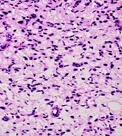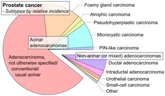 A histopathologic diagnosis of prostate cancer is the discernment of whether there is a cancer in the prostate, as well as specifying any subdiagnosis of prostate cancer if possible. The histopathologic subdiagnosis of prostate cancer has implications for the possibility and methodology of any subsequent Gleason scoring.[1] The most common histopathological subdiagnosis of prostate cancer is acinar adenocarcinoma, constituting 93% of prostate cancers.[2] The most common form of acinar adenocarcinoma, in turn, is "adenocarcinoma, not otherwise specified", also termed conventional, or usual acinar adenocarcinoma.[3]