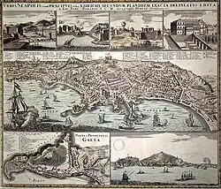 The city has two original ancient nucleuses: the first is the hill of Pizzofalcone on which the city of Partenope was born, while the second is the zone of the decumanus of Naples where the following Neapolis was born.[2] In this last space, in particular, all the buildings over the centuries have concentrated until the 16th century, with the opening towards the west of the city at the behest of the Spanish viceroy don Pedro de Toledo.