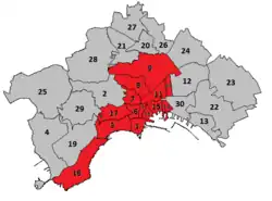 The area is considered a UNESCO heritage site covering approximately 1021 hectares[3] and contains the following quarters: Avvocata, Montecalvario, San Giuseppe, Porto, Pendino, Mercato (Municipalità I), Stella, San Carlo all'Arena, (Municipalità III), Chiaia, San Ferdinando, San Lorenzo, Vicarìa and part of the Vomero and Posillipo hills.