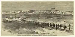 For most Chinese immigrants of the 1850s, San Francisco was only a transit station on the way to the gold fields in the Sierra Nevada. According to estimates, there were in the late 1850s 15,000 Chinese mine workers in the "Gold Mountains" or "Mountains of Gold" (Cantonese: Gam Saan, 金山). Because anarchic conditions prevailed in the gold fields, the robbery by European miners of Chinese mining area permits were barely pursued or prosecuted and the Chinese gold seekers themselves were often victim to violent assaults. At that time, "Chinese immigrants were stereotyped as degraded, exotic, dangerous, and perpetual foreigners who could not assimilate into civilized western culture, regardless of citizenship or duration of residency in the USA".[44] In response to this hostile situation these Chinese miners developed a basic approach that differed from the white European gold miners. While the Europeans mostly worked as individuals or in small groups, the Chinese formed large teams, which protected them from attacks and, because of good organization, often gave them a higher yield. To protect themselves even further against attacks, they preferred to work areas that other gold seekers regarded as unproductive and had given up on. One of the more violent incidents was a battle in 1861 with Native American miners who wanted to pan at Pike Flat which the land was own by the Chinese. So the two parties meet near a log cabin and drew two lines of battle and begin to fight with the Chinese successfully defending their clam.[45] Because much of the gold fields were exhaustingly gone over until the beginning of the 20th century, many of the Chinese remained far longer than the European miners. In 1870, one-third of the men in the Californian gold fields were Chinese.
