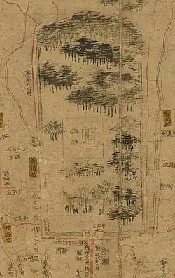 After establishing Joseon in 1392 (Korean calendar), the founding king Taejo (r. 1392–1398) began work in establishing a new capital for his state.[1] Kwŏn Chunghwa, an expert in feng shui, was placed in charge of choosing the location of the capital. In 1392, he chose a site near the mountain Gyeryongsan in South Chungcheong Province. After facing opposition, in the 8th month of 1394, it was decided that Hanyang (now "Seoul") would be the capital.[2] There was fierce debate over where the palace and city proper should be, with eight candidate sites in the region identified.[3] One proposed location for the palace was slightly north of its current location on the site of a Goryeo-era palace now called Namgyŏng Igung (남경 이궁; 南京離宮), but it was decided that the space was too small.[4]