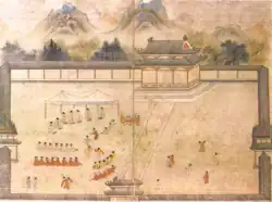 The palace remained in much the same form from Sejong's reign for around a hundred years.[33] Sejong's son Sejo moved out of Gyeongbokgung and preferred Changdeokgung.[34] Gyeongbokgung saw use especially for events and hosting foreign dignitaries.[23] In 1461, the office Suridogam (수리도감; 修理都監) was put in charge of maintainining and restoring the palace.[35] The palace experienced a fire on the 15th day, 12th month of 1467.[36] In the 9th month of 1528, the palace was extensively renovated.[37]