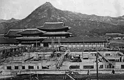 Meanwhile, the palace and Korea experienced significant political turmoil.[97] In 1894, amidst a truce during the 1894–1895 Donghak Peasant Revolution, Japanese troops stormed and occupied the palace and installed a pro-Japanese government. This set off the First Sino-Japanese War.[98] In 1895, the Korean Queen Min was assassinated by Japanese agents at Geoncheonggung in the palace.[99] The assassins also looted the palace during the attack.[100] Afterwards, Gojong fled to the Russian legation for protection in 1896.[101]